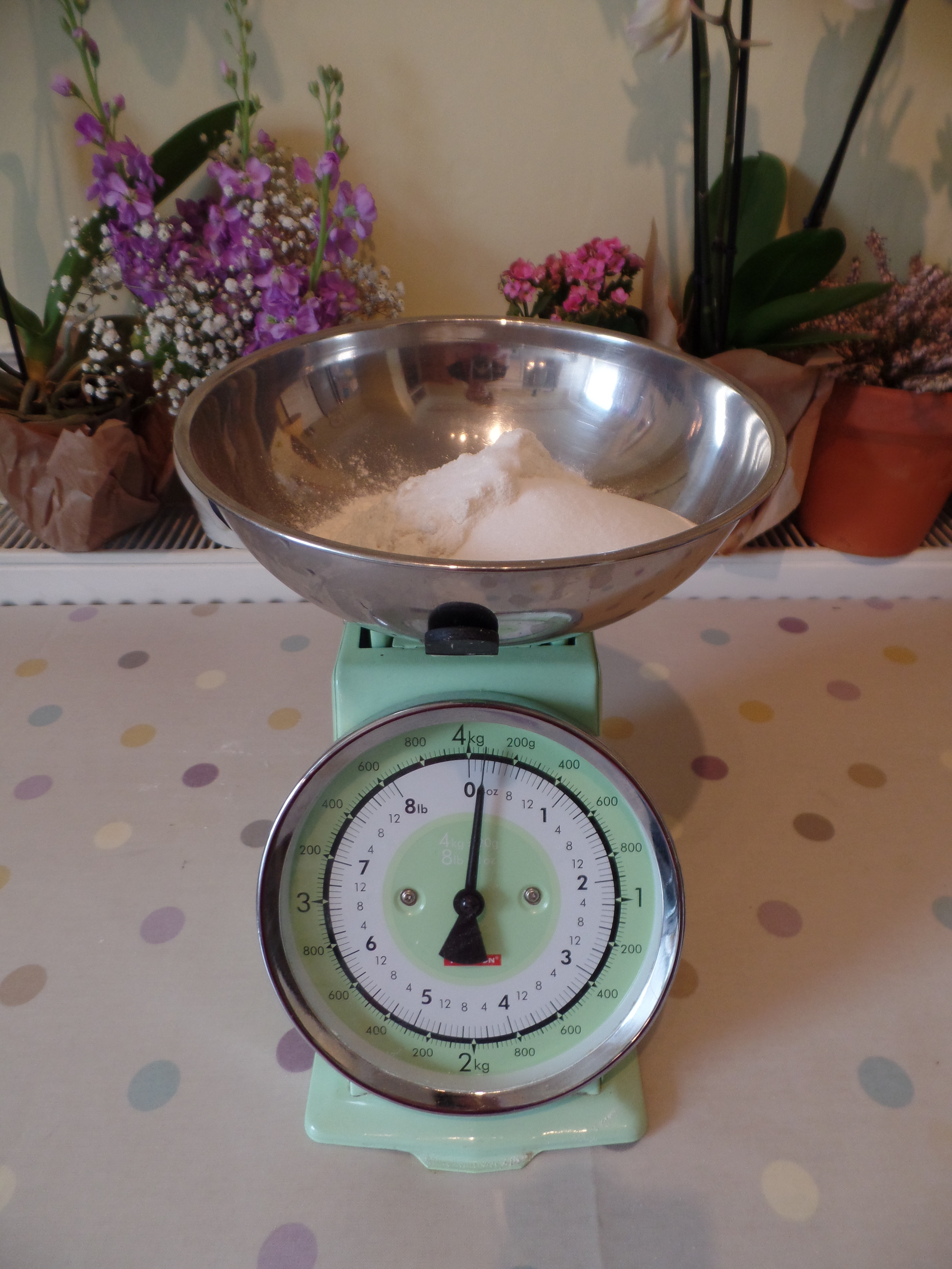 2. To make the pastry…Measure out all of your ingredients then tip the flour, caster sugar and salt into a bowl. Cut your butter into chunks then add it to the flour and salt.