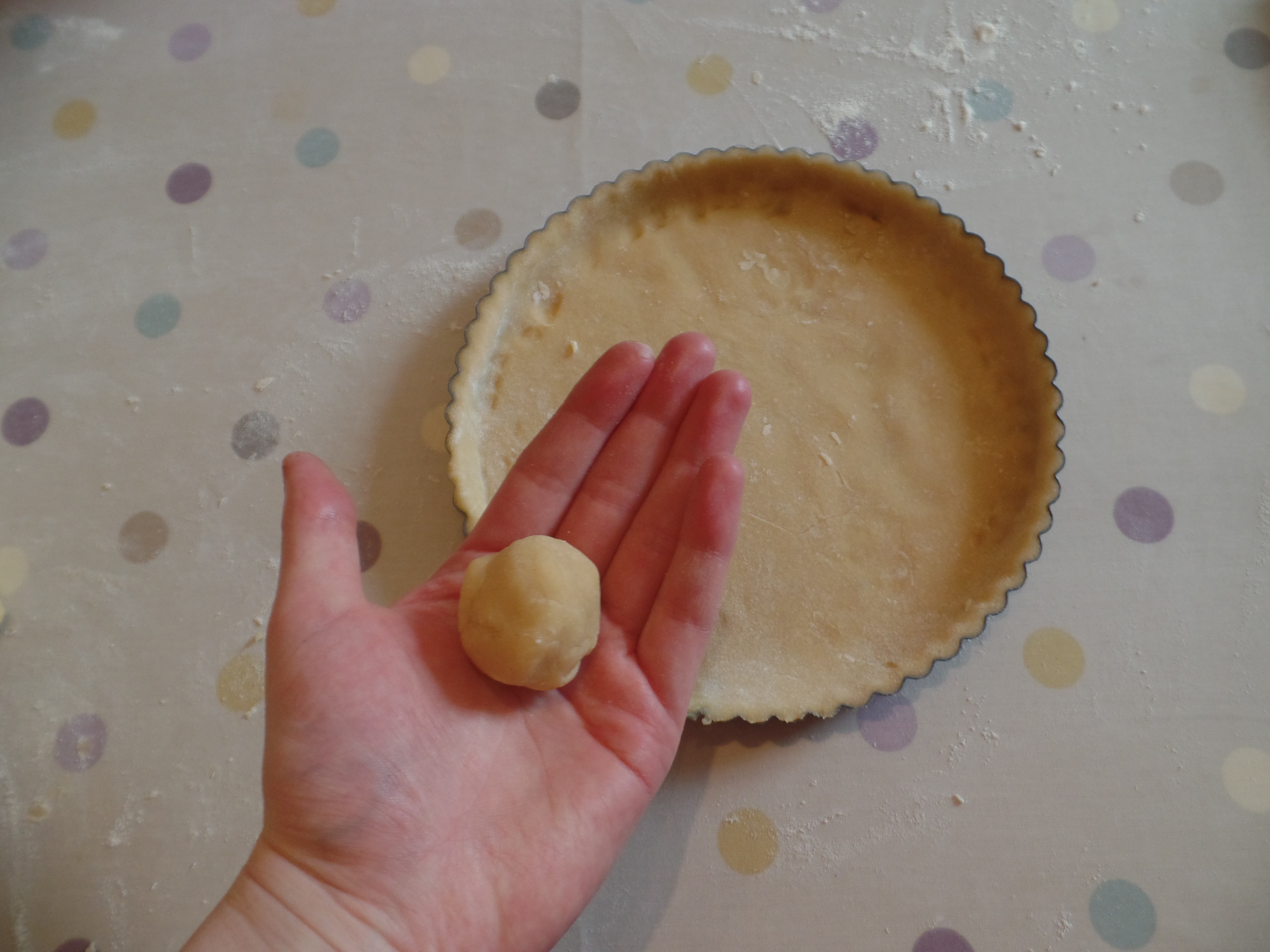 5. Once your pastry is chilled, roll it out and place it in your fluted pastry tin, being sure to press the pastry into the sides of the tin with a leftover ball of pastry.