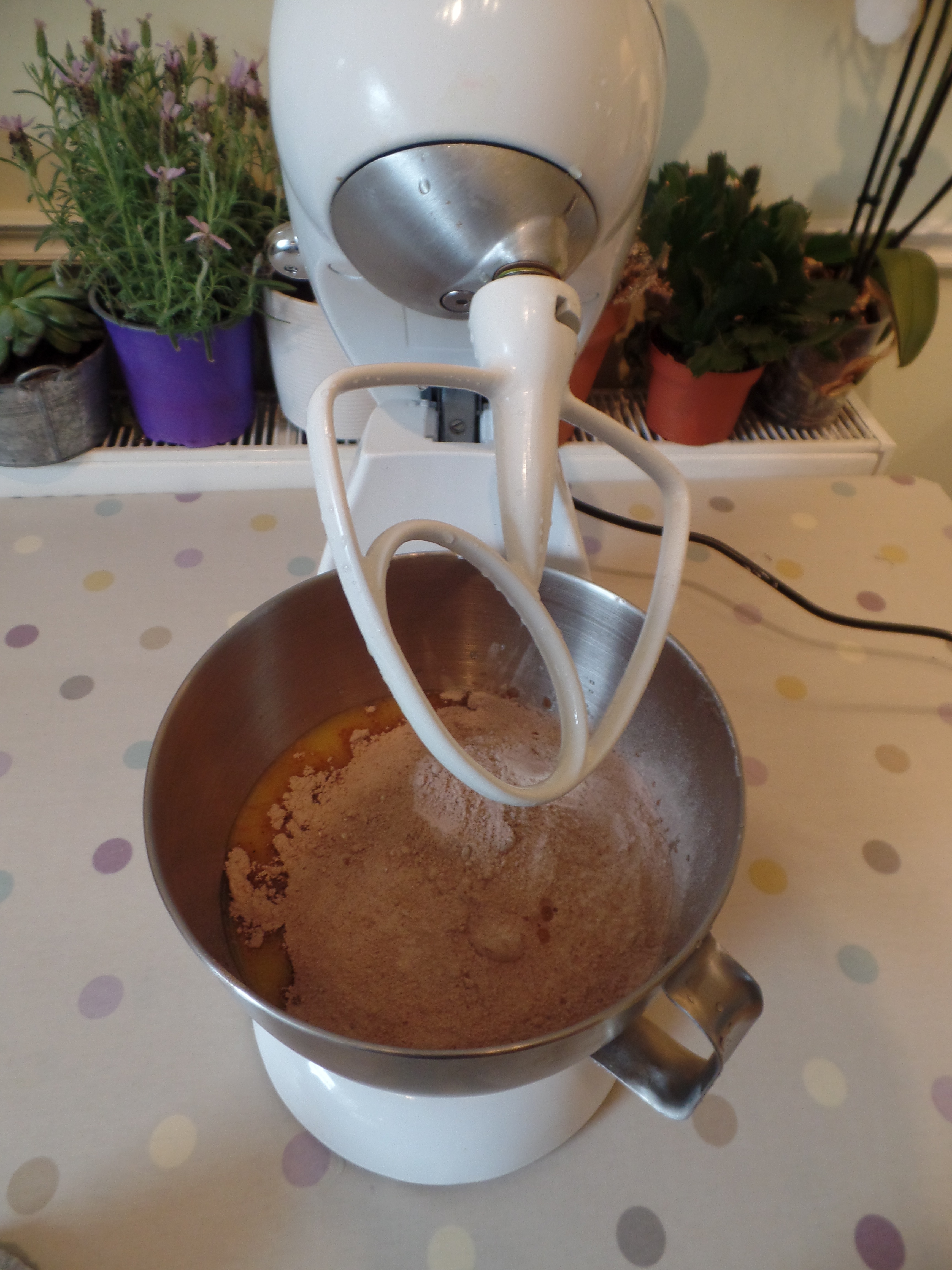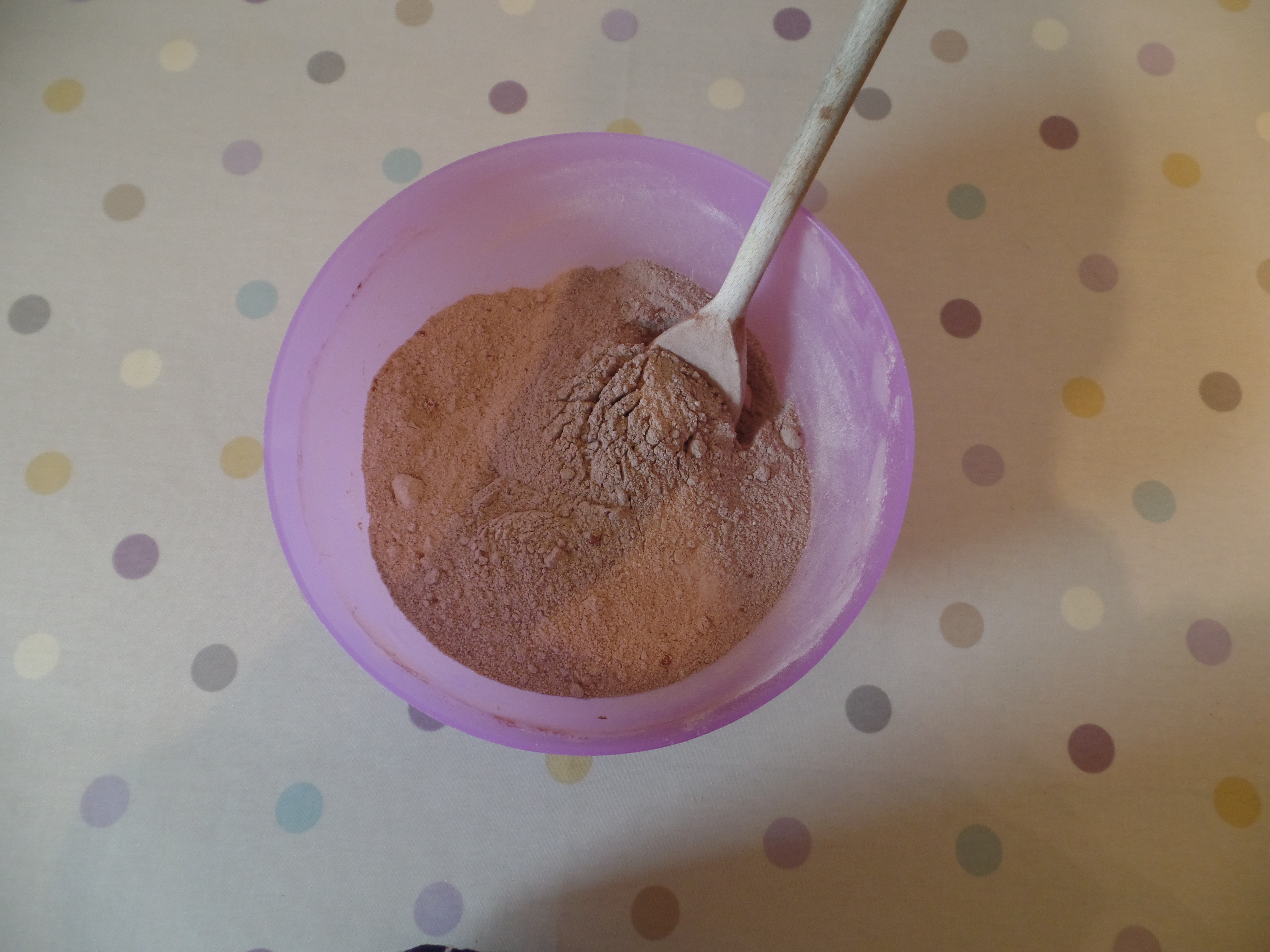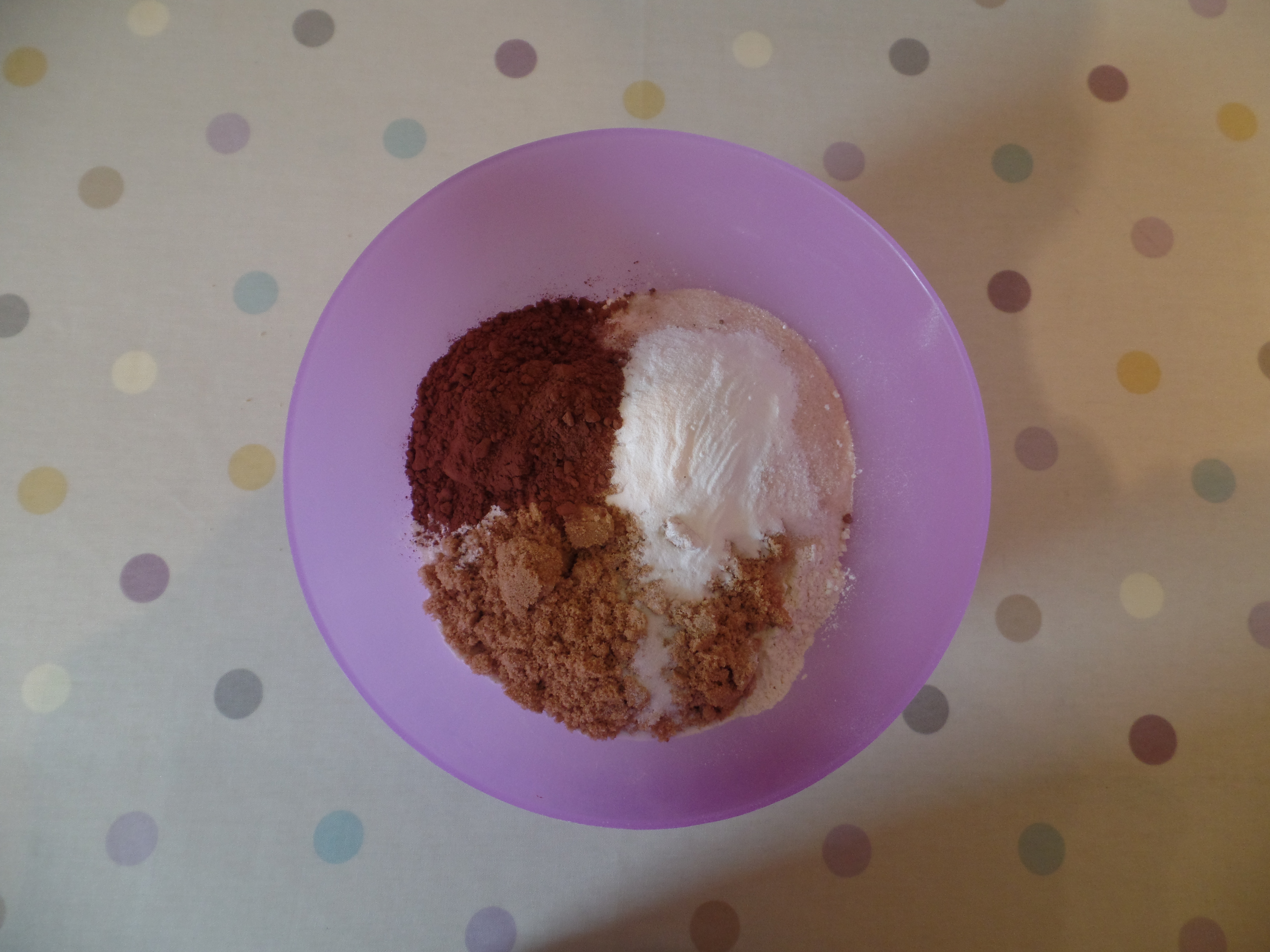 2. In a large bowl, mix together the flour, sugars, cocoa, baking powder, bicarb and salt.