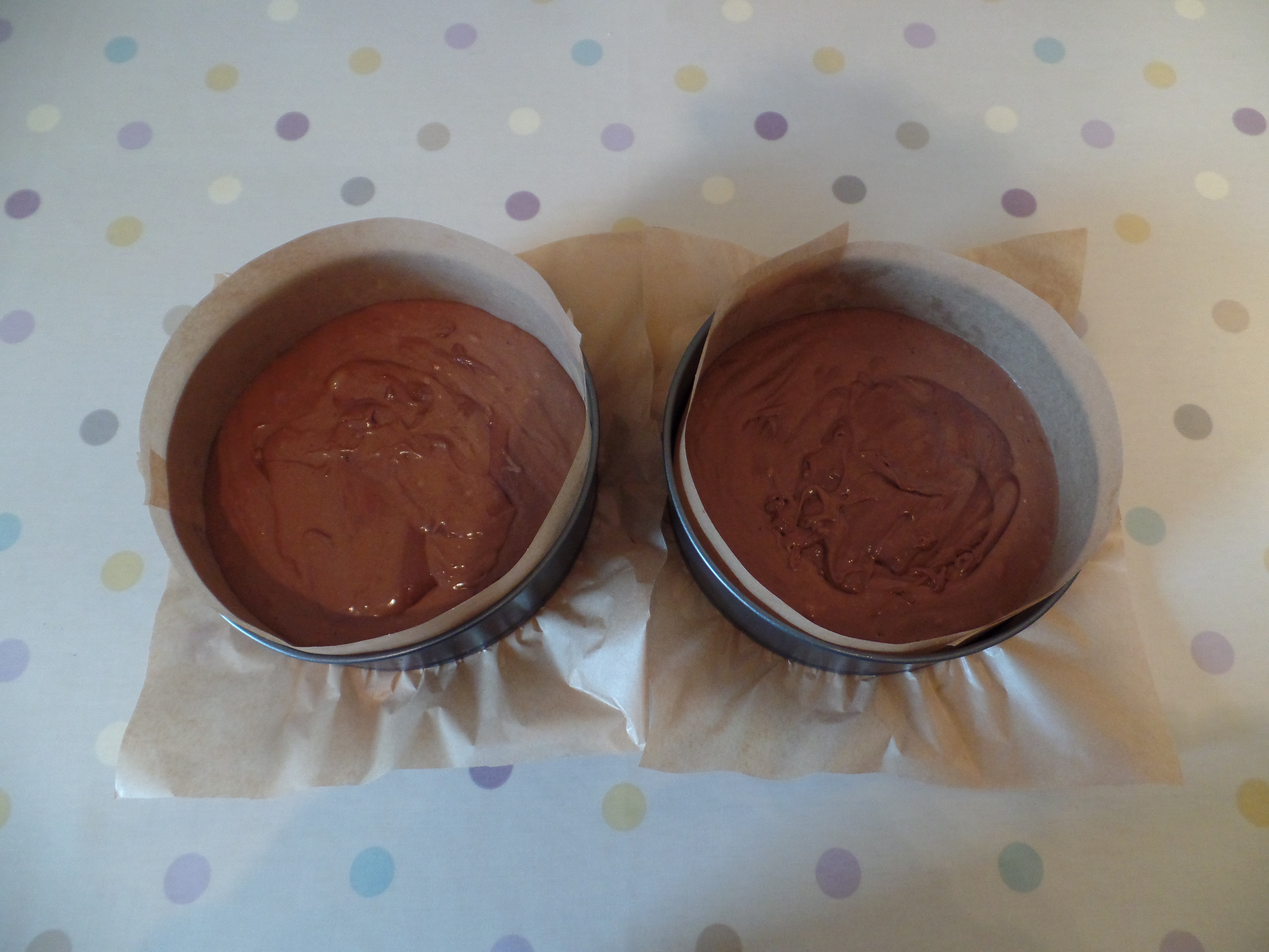 6. Add the egg mixture, and mix again until everything is blended and then pour into two lined 8 inch cake tins.