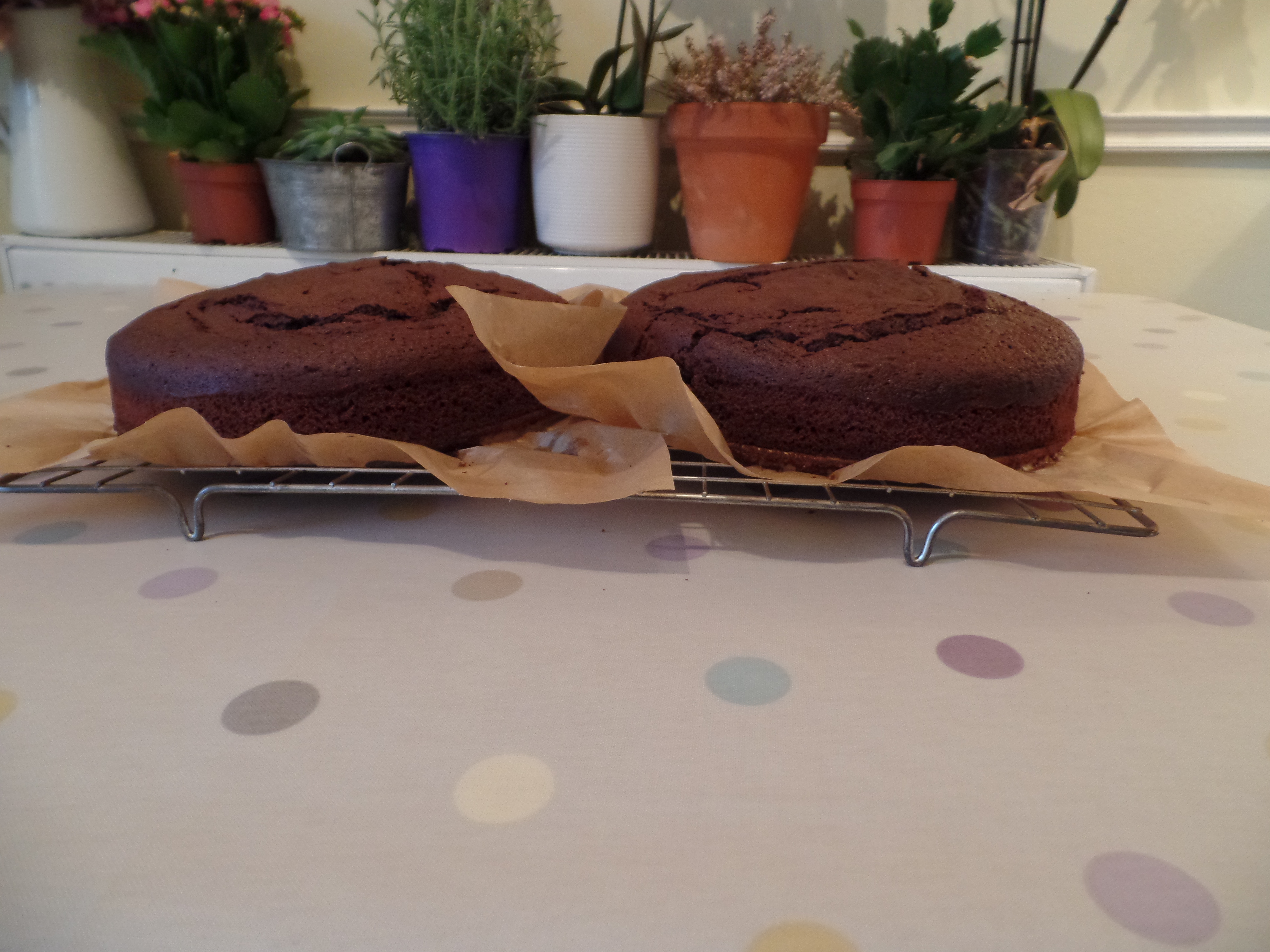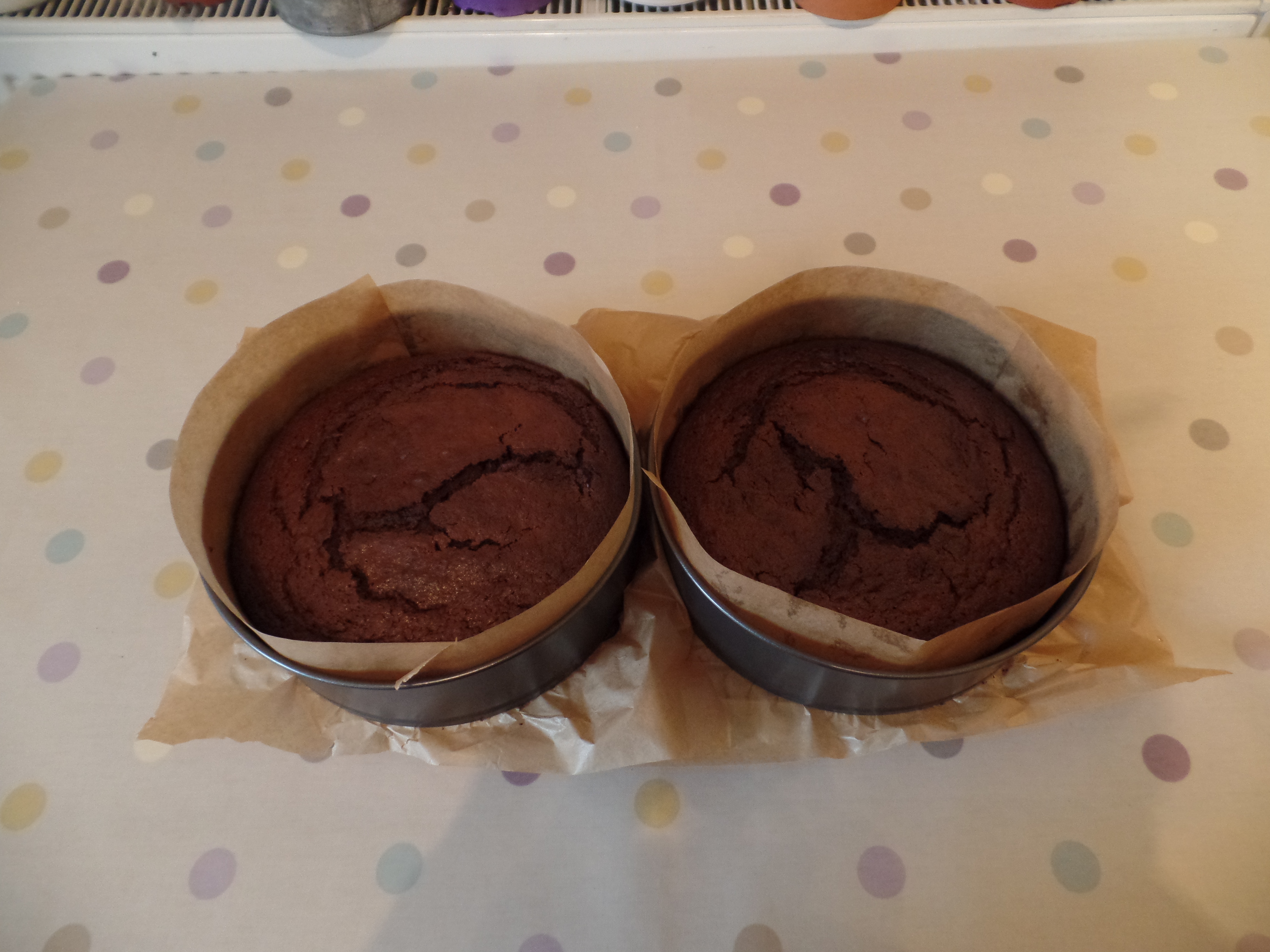7. Bake the cakes for 50-55 minutes, or until a cake-tester comes out clean. Cool the cakes in their tins on a wire rack for 15 minutes, and then turn the cakes out onto the rack to cool completely.