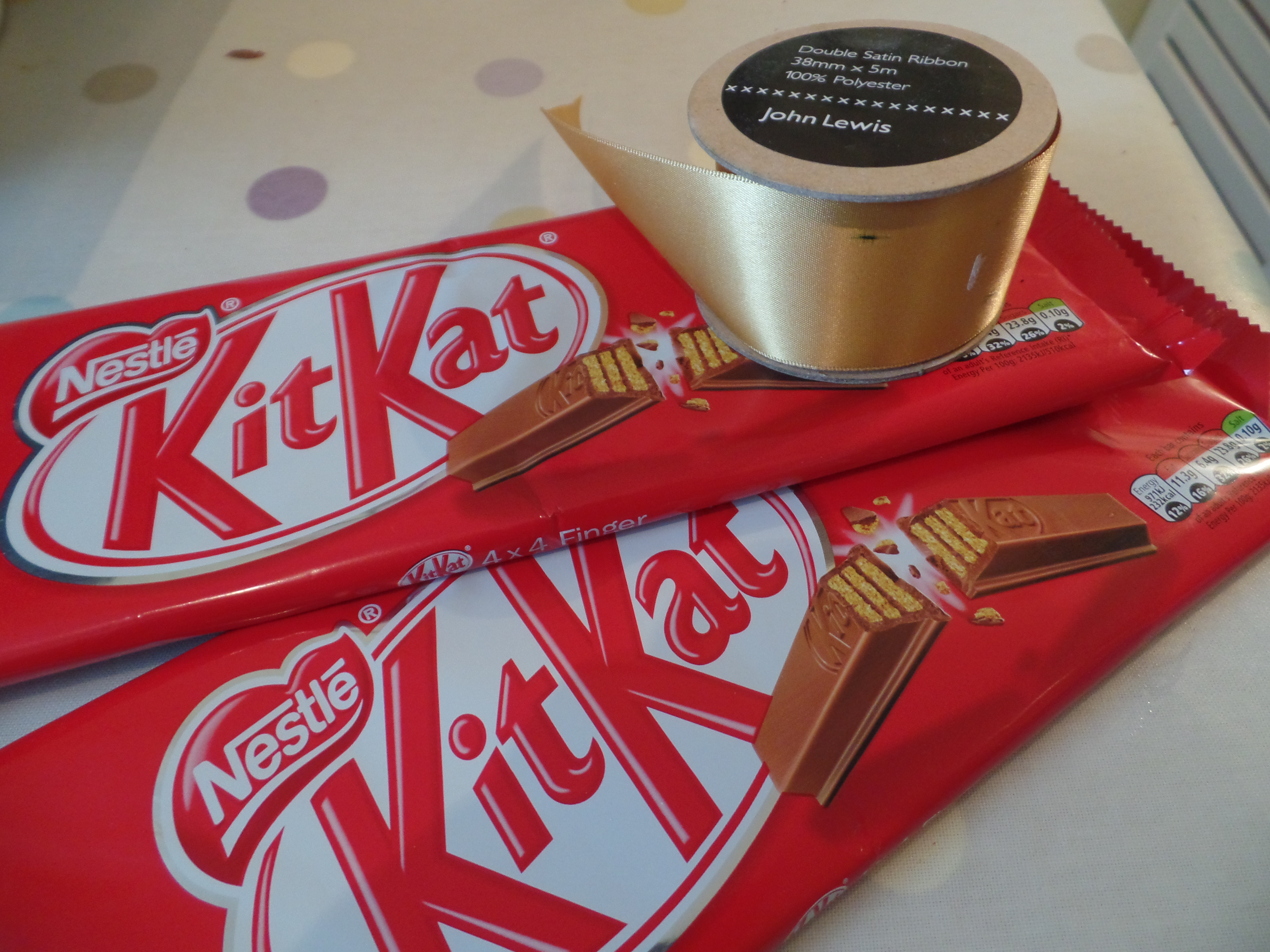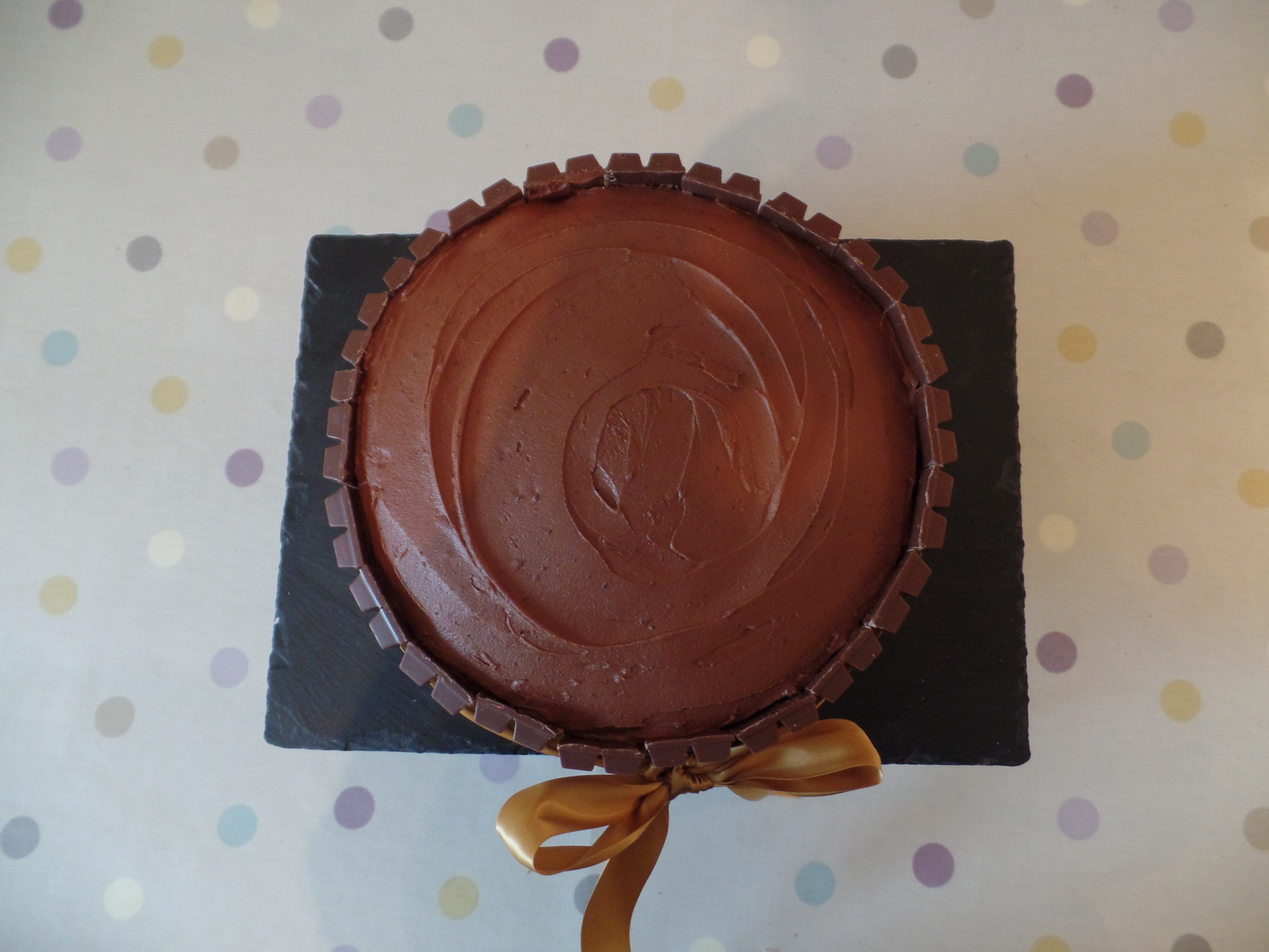 2. Stick the Kitkat fingers around the cake and then hold in place by tying a bow around the cake.