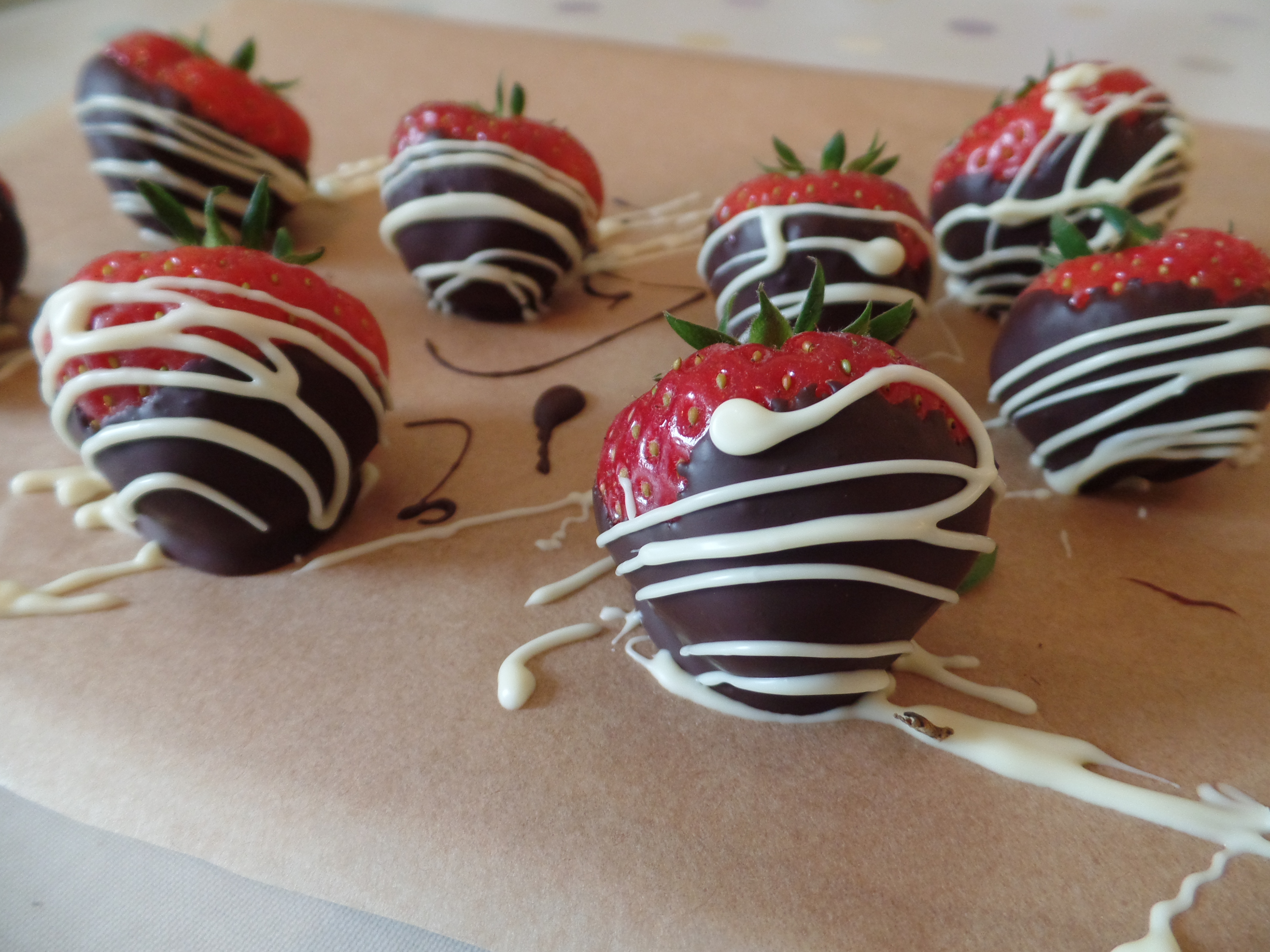 3. Melt your bar of white chocolate and dark chocolate in the microwave. Then dip your strawberries in the dark chocolate and then drizzle with the white chocolate.