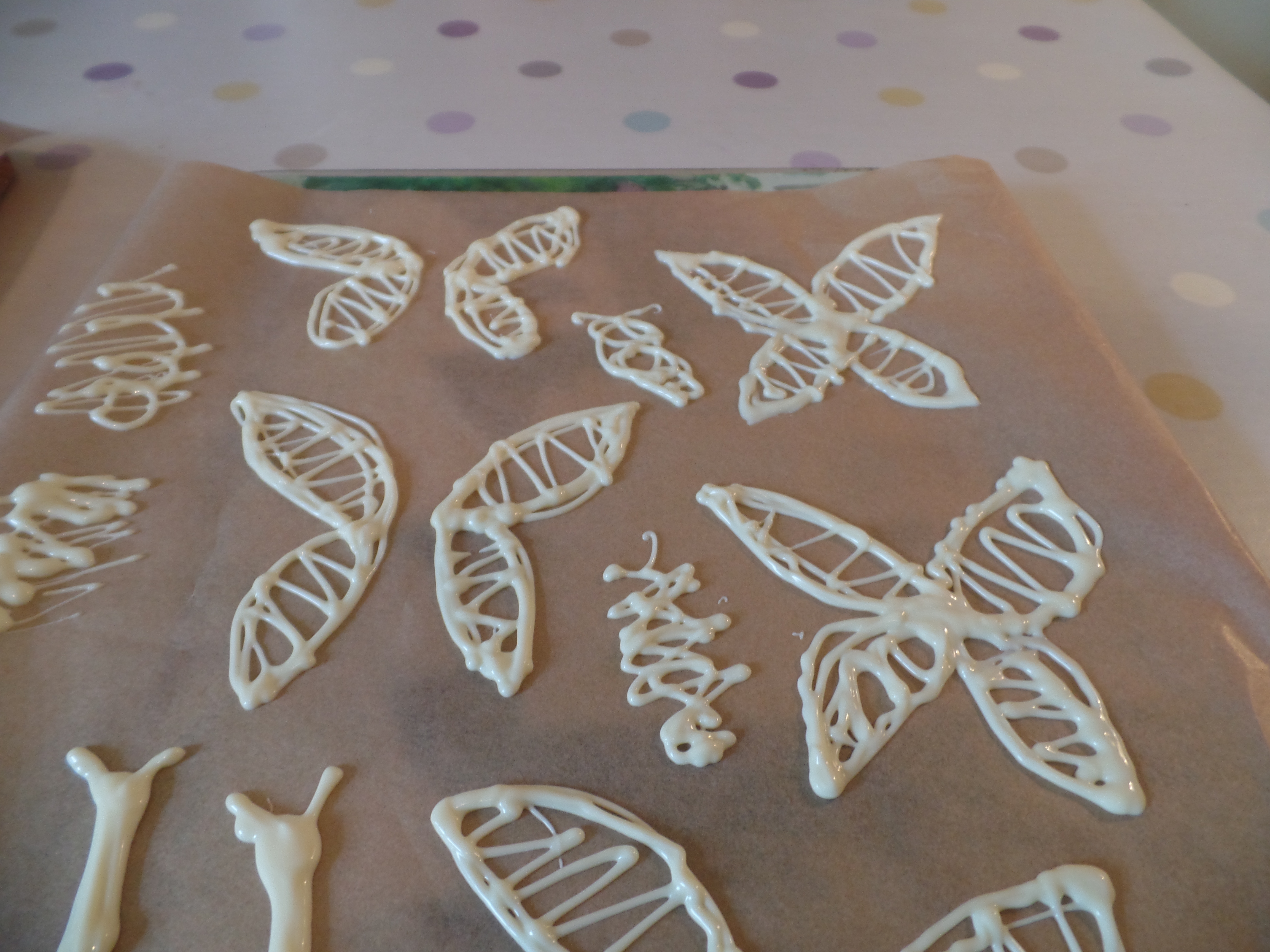 4. You can fill a piping bag with either chocolate and make some shapes- I did some white chocolate butterfly wings.