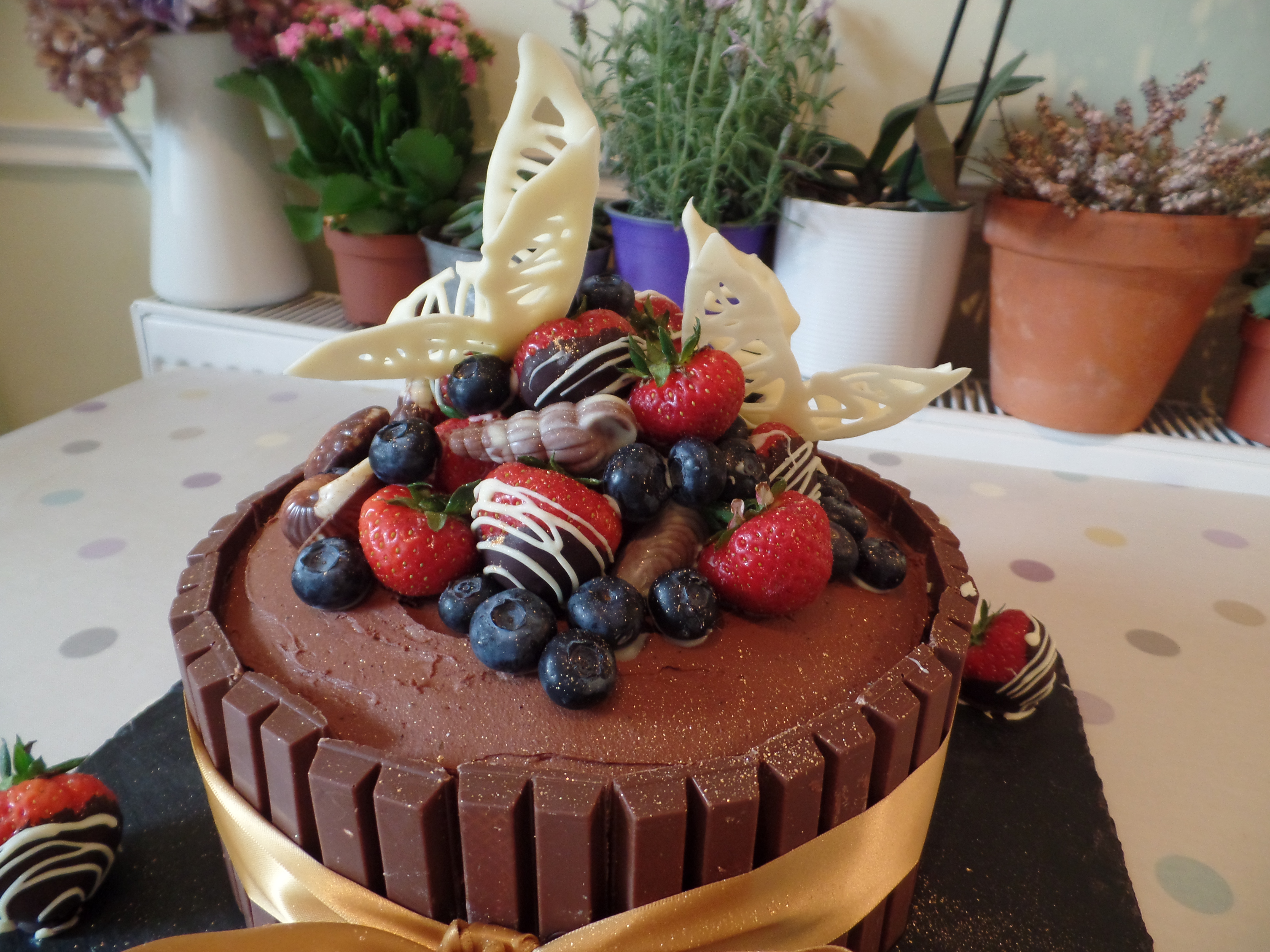 TO FINISH… Stack the chocolates, strawberries, blueberries and chocolate shapes on top of the cake in any manner you please. You can also sprinkle with edible glitter if you have some!